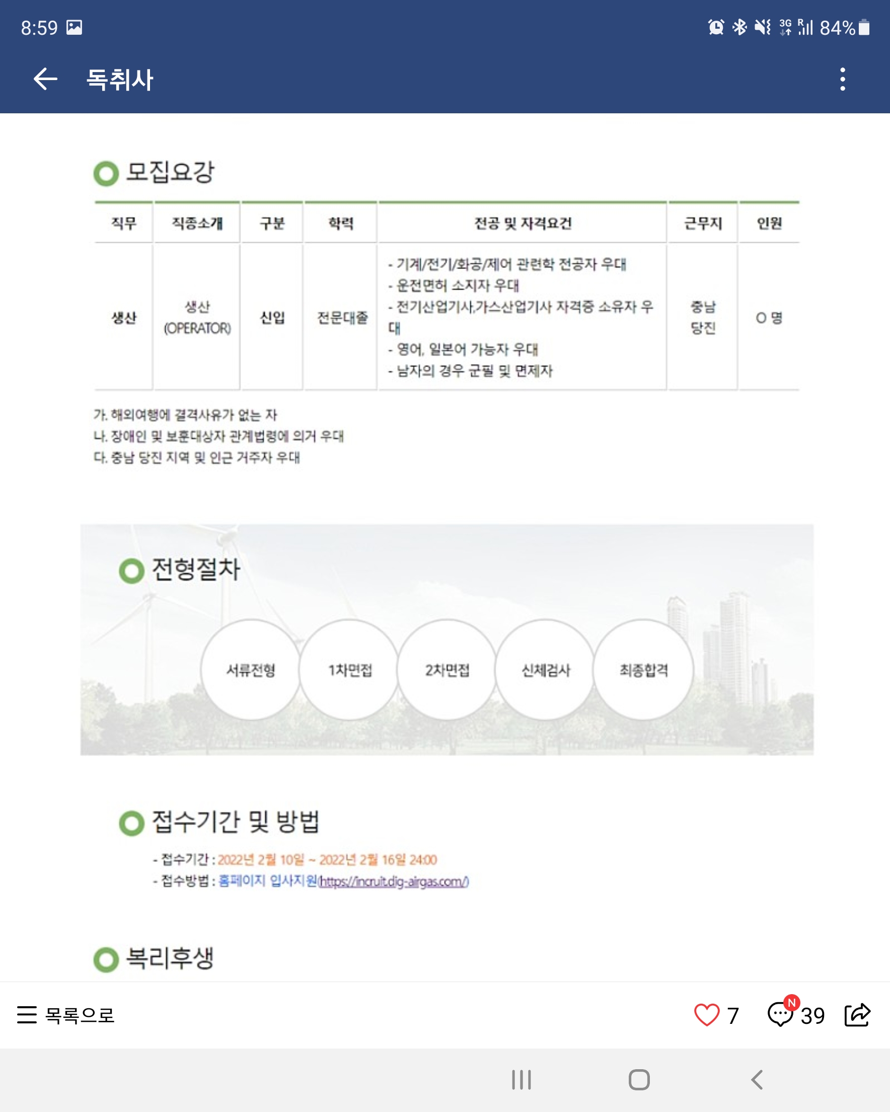 사진을 보시면 알겠지만 아쉽게도 초대졸만 뽑고 있고요, 전기랑 가스산업기사 소유자를 우대하고 있습니다만, 전기자격증 보유자를 더 선호한다고 합니다.